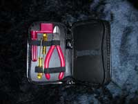 C工具セットあると便利な弦交換工具セット。左上の赤いのは「ワインダー」という、ペグを回す道具。弦を交換する際は長さ調節のために切る事もありますので、ニッパーやペンチのようなものが必要です。楽器屋さんに行くと、写真のようなセットは1000円以内で購入できますので、できれば持っていたほうが良いでしょう。 |
