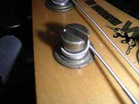 H伸ばす良いのか悪いのか。。。僕にもわかりませんが、少なくとも不都合は出ていないので試してください。全て弦を張り終わった後、各弦ともグイグイと引っ張って弦を伸ばします(もちろん、弦が切れるほど引っ張ってはいけません)。チューナーでチューニングしながら行うと良くわかりますが、弦を伸ばすことで音程が半音〜1音近く下がります。それだけ弦が伸びている訳です。弦を替えたばかりの時にチューニングが狂う原因の一つです。先に伸ばしておくことで演奏中にチューニングが狂うことをある程度防ぐことが出来ます。 |